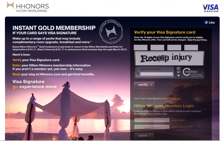 Hilton is offering Gold status to Visa Signature cardholders. Simply register your card here and your account will automatically be updated to Gold Status and if you stay three times by August 31, 2011, they will extend that Gold status until March 2013. I think this is a great deal, especially since the Citi HHonors Hilton Visa Signature card has no annual fee and currently has a 40,000 point sign-up bonus when you spend $1,000 within the first four months (see more details below).