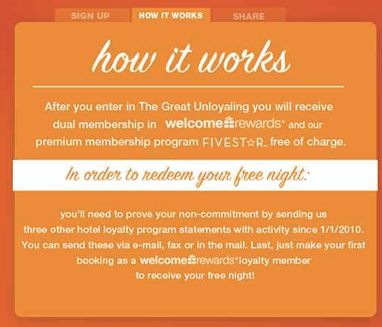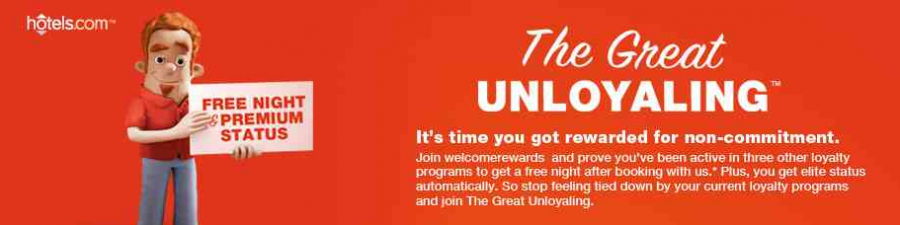 However, Gary Leff's recent post about Hotels.com's new "Great Unloyaling Promotion" piqued my interest. Basically, if you've stayed with three hotel chains from January 1, 2010 (not 2011 like I originally thought) to present and were a member of their loyalty programs, then Hotels.com will give a free night when you book a night through them. All you need to do is email/fax them statements that show activity from three different hotel chains. There's nothing in the rules excluding award stays and I bet they will be lenient with the interpretation since the whole point of this promotion is to bring in more members - not to make people angry. Also, Hotels.com's program is based on simplicity, so I bet they won't be sticklers on what exactly constitutes activity. This is for new members only, but I imagine if you used a new email and address you'd be eligible.