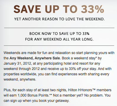 2) You can get another 1,000 points if you book your 2012 weekend stay through this link by January 31, 2012 (note: this is a pre-loaded rate, so make sure you aren't paying extra for the points). Also, the Facebook promo says its a 24-hour sale starting January 17, but the link says you just need to book by January 31.