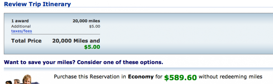 Case in point, this morning my Mom emailed saying that she wanted to see my grandmother this weekend in Asheville, NC. There's a nonstop flight Newark- Asheville, but the flight cost $589, which was pretty steep. However, United also had saver award availability for only 20,000 miles roundtrip (flights under 700 miles are only 20,000 miles roundtrip vs. the standard saver 25,000) and $5 in taxes/fees! Luckily, since I'm a United Premier Platinum, I could book the award for her and avoid the annoying $75 last-minute ticketing fee for travel within 21 days of departure, and then my Mom transferred 20,000 Ultimate Rewards points to me to cover the cost of the awrd. In the end, those 20,000 United miles saved them $584, or 2.9 cents per mile - pretty awesome for a domestic coach redemption.