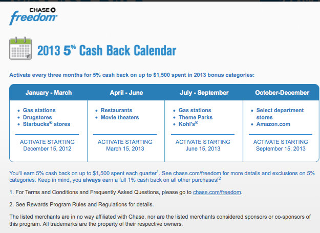 Activate Chase Freedom For 2013 Quarter 1 (No longer open to new applicants): As a recap from earlier this week, you may now activate your Chase Freedom card for the first quarter category spending bonuses where you can earn 5 Ultimate Rewards points per dollar you spend at select merchants. This time around, the Q1 2013 bonus categories: Gas stations, drugstores and Starbucks. You have until March 14, 2013 to activate (though you might as well do so now), and then all your expenditures at those types of merchants up to a cap of $1,500 for the quarter will earn 5 points per dollar. Even if you don't have the card yet, but were planning on getting it, Chase will retroactively credit you with the bonus points on your category spending from the whole quarter. Freedom's 5x spending bonuses are one of the best ways to rack up bonus Ultimate Rewards points using your Chase Freedom Visa or Freedom Mastercard. Points earned with the Freedom card can be transferred to Ultimate Rewards' travel partners if you have one of the premium cards like the Sapphire Preferred, or Ink Bold or Ink Plus.