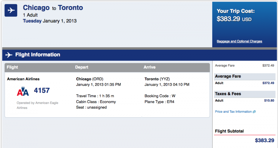 To purchase that exact flight on AA.com, you'd need to spend $383.29.