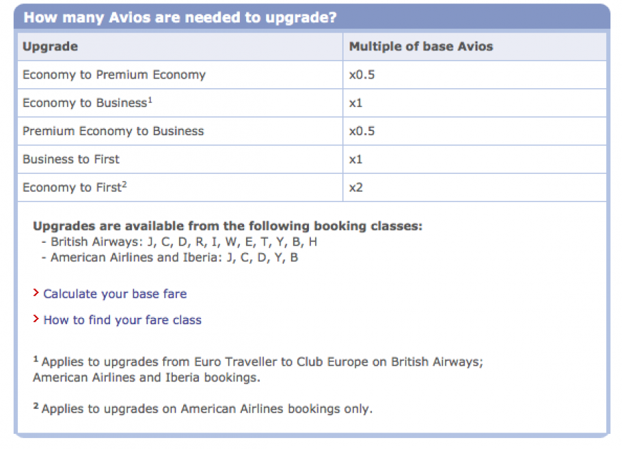 3) Upgrading Paid Tickets from Premium Economy to Business Class. British Airways has four classes of service on most international flights: economy, premium economy, business and first and they allow upgrades from one class to another for a relatively small amount of Avios. To calculate how many you need to go up one class, you take the amount of Avios needed for an economy award on that route and halve it. NYC to London is 20,000 Avios each way for coach awards, so an upgrade from Premium Economy to Business would only cost 10,000 Avios each way.