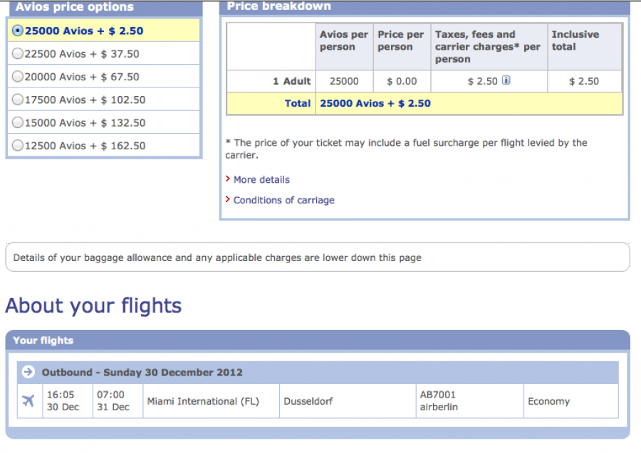 6) Transatlantic flights on Air Berlin. New Oneworld carrier Air Berlin is yet another carrier who you can fly across the Atlantic to avoid huge taxes and fees and awards can be booked on Britishairways.com, so no need to call and get hit with phone booking fees. I pulled up a sample Miami to Dusseldorf flight that came to 25,000 Avios and $2.50 one-way in economy.