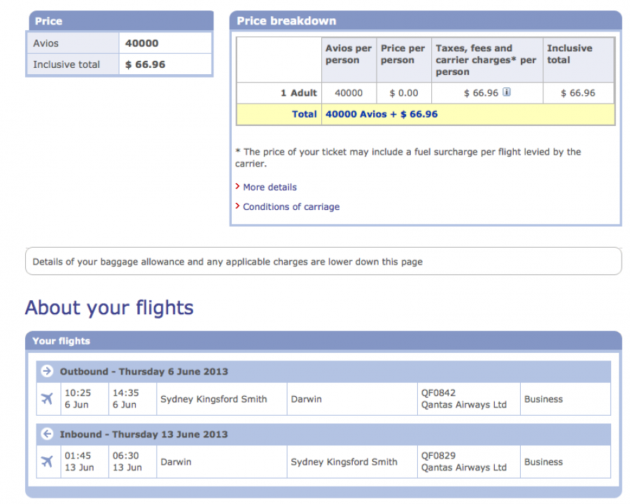 9) Intra-Australia flights on Qantas. While British Airways adds on approximately $780 on Qantas awards from the US to Australia, flights within Australia has very low fees (and are often very expensive to purchase). A business class Sydney-Darwin flight costs only 40,000 Avios and $66.96 vs. purchasing for $1,979! Qantas codes all of their domestic premium flights as business class so it only costs twice the price of economy redemptions, whereas in the US, AA classifies many 2-cabin flights as "first" class so it costs 3x the price of Avios (I wrote about this issue here).