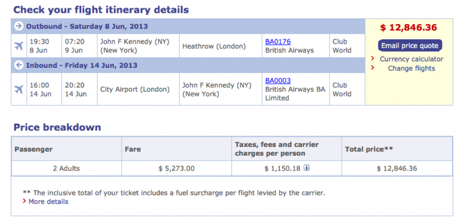 The same itinerary is currently priced at $12,846 (it is possible to get cheaper, but this was the first random date I selected where the a Travel Together Ticket was available).
