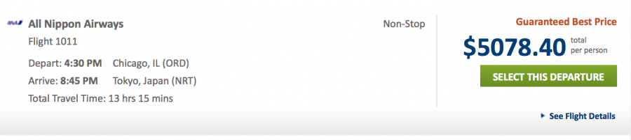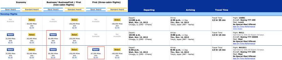 I found flights from Chicago to Tokyo aboard United in business class for 60,000 miles and $2.50 on ANA in business class of 67,500 miles in first class.