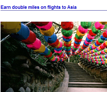 Get Double AAdvantage Miles To Asia: American Airlines is offering double miles for flying between the US to Asia on travel dates from December 1, 2013 through February 28, 2014. Flights operated by American and Japan Airlines code shares between Chicago O'Hare, Dallas-Ft. Worth and Los Angeles to Tokyo Narita; and between Dallas-Ft. Worth and Seoul ICN count. The offer applies only to AAdvantage members who purchase and fly on purchased, published First Class or Business Class fares booked in F, A, P, J, R, D or I; Economy Class fares booked in Y, B, H, K, M, L, V, S, N, or G on American Airlines operated flights; First Class or Business Class fares booked in F, A, J, C, D or I; Economy Class fares booked in Y, B, H, K, M, L, V, S, N, or G on Japan Airlines marketed flights. Flights operated by other codeshare partners are not eligible for this promotion. Bonus miles do not count toward elite status qualification or AAdvantage Million Miler status. Double miles will be calculated at 100% of the base miles earned. For more information and to register for the promotion, click here using the promo code JPKR1.