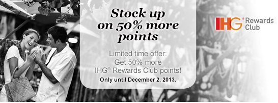 IHG Rewards Club 50% Bonus on Purchased Points: IHG is offering up to a 50% bonus on purchased points now through December 2, 2013, depending on how many points you purchase.