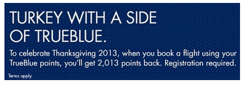 Jet Blue Award Rebate: When you book award travel on JetBlue by December 2 for travel between November 25, 2013 – January 31, 2014, JetBlue will refund you 2,013 True Blue points. You must register prior to booking. That's the equivalent of about $20-25 in travel. Some JetBlue fares start as low as 5,000 points, so this could be up to a 40% rebate on your points.