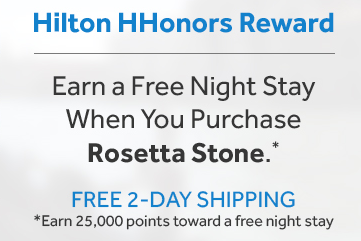 Earn 25,000 HHonors Points Towards A Hilton Stay When You Purchase Rosetta Stone: Have you always wanted to learn a language? Well now is the perfect time since Hilton has teamed up with Rosetta Stone so that when you purchase a Rosetta Stone course, as you can get 25,000 Hilton Honors Points towards a free night stay at a Hilton hotel. Rosetta comes as a CD-Rom set, or you can download it online. It costs $499 and comes in the following languages: Chinese (Mandarin) German, Spanish (Spain), Spanish (Latin America), English (American), English (British), Italian, Russian and French. The 25,000 points are enough for a Standard Room Reward night at participating Category 1-3 hotels and at select Category 4 hotels, and this offer runs now through January 10, 2014.