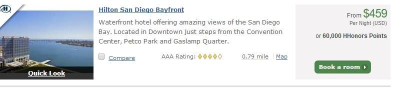 However, I priced out 4 nights at the San Diego Bayfront Hilton in June at $459 per night, for a total of $1,836. This hotel costs 60,000 points per night, so you could instead purchase the 250,000 point package for $1,238 (Amex discount included), and save $598 over those 4 nights (plus 10,000 unused HHonors points). In this scenario points are by far the better option.