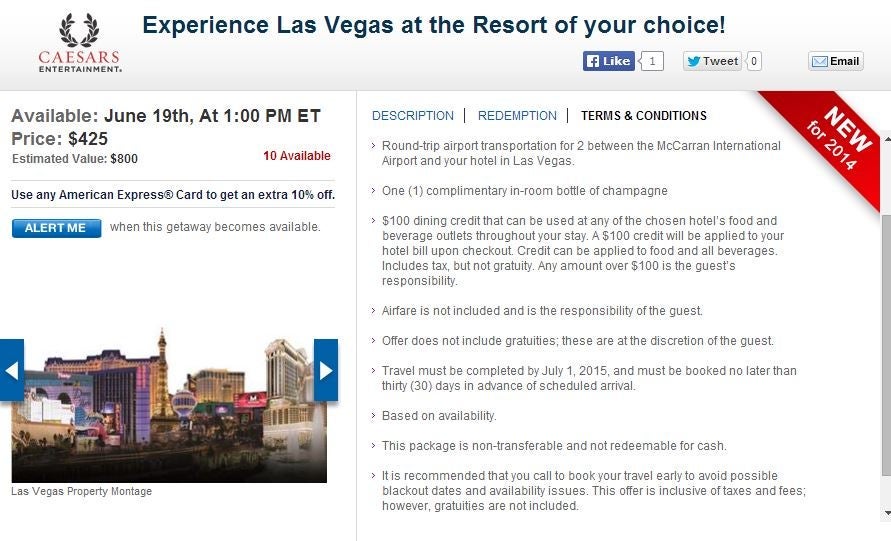 One of the deals with the most availability (however, still just 10) is one that allows you to choose two nights in one of the following Caesar's properties in Las Vegas: Bally's, Caesars Palace, Flamingo, Harrah's, Paris, Planet Hollywood Resort, The Quad Resort & Casino, or the Rio All-Suite Hotel & Casino. The offer also includes $100 dining credit, $150 spa credit, an in-room bottle of champagne and round-trip airport transportation for two between the airport and hotel in Las Vegas. You must travel byJuly 1, 2015.