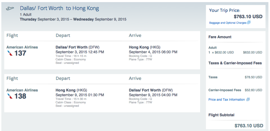 Dallas (DFW) to Hong Kong (HKG) for $763 on American (earns 16,200 EQMs):