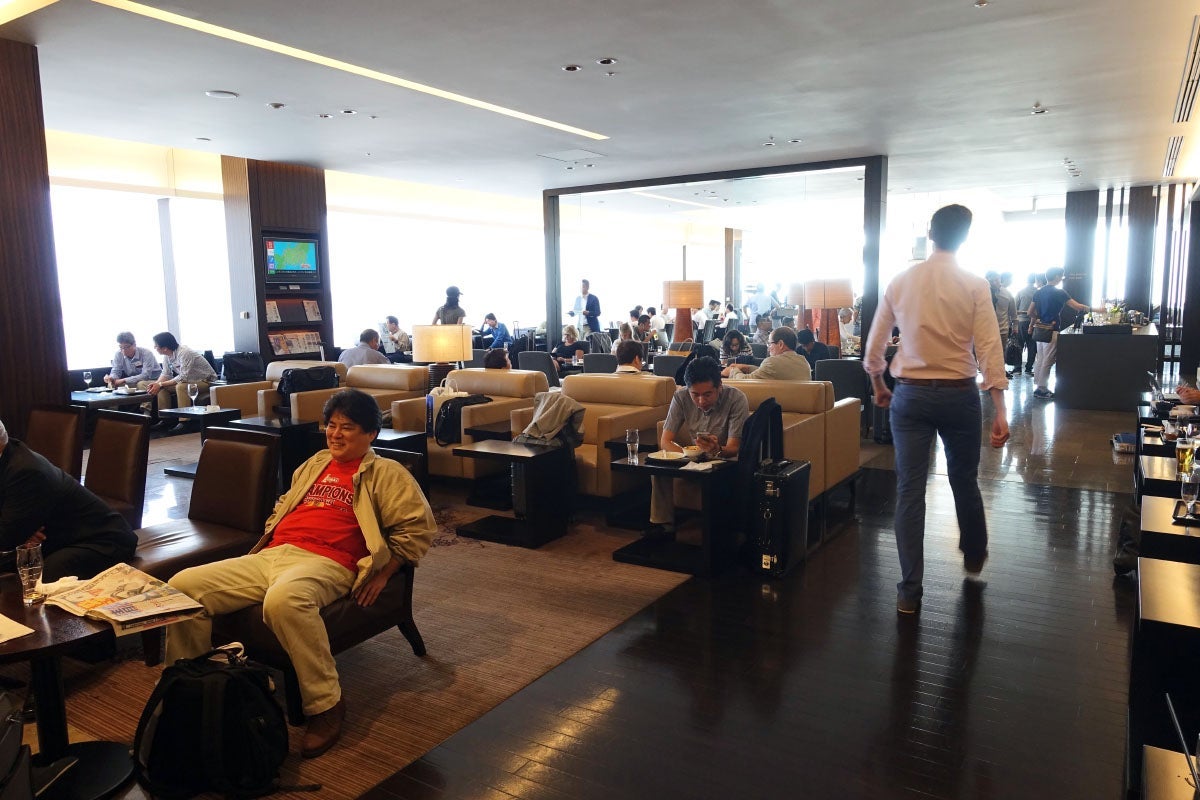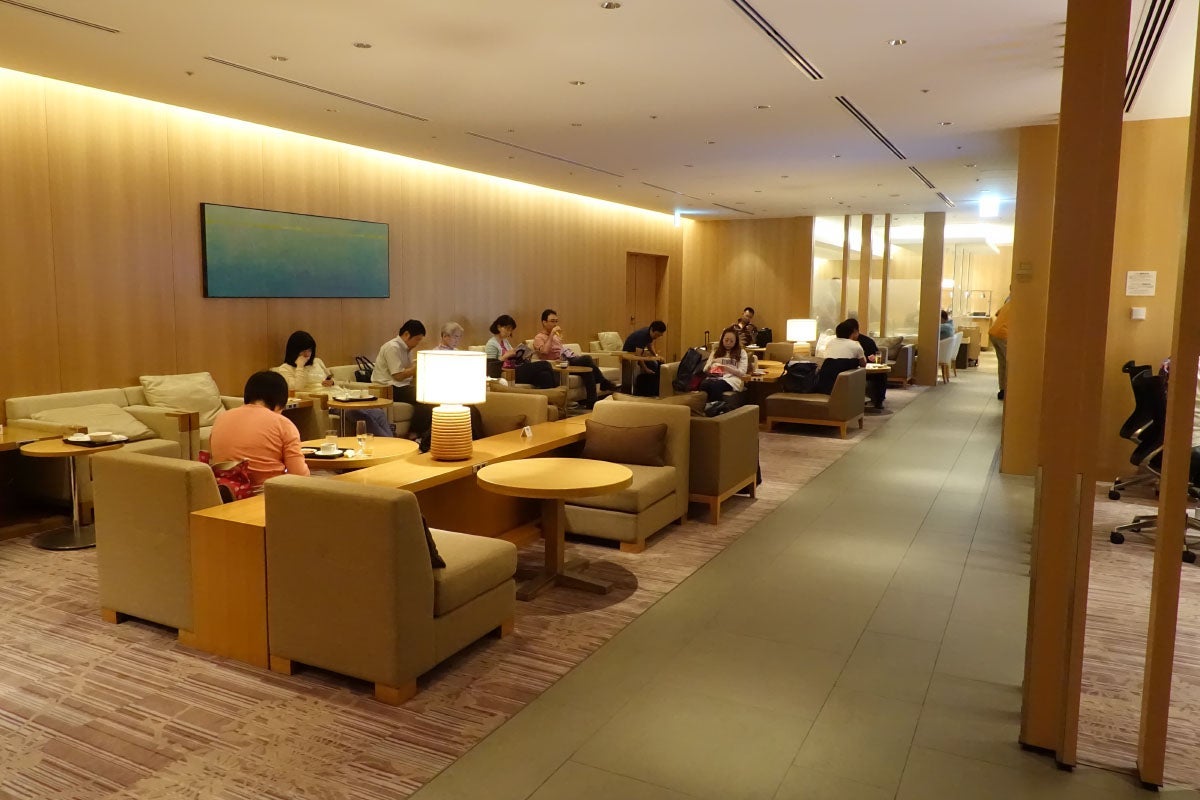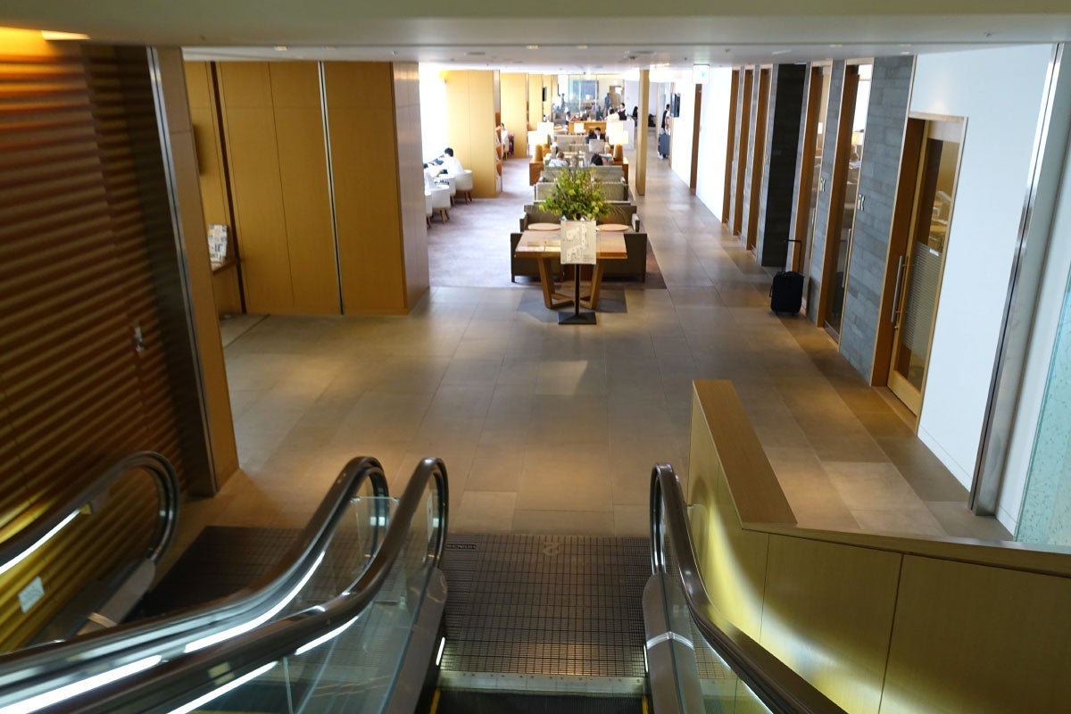 The Sakura lounge, which is open to all business and first-class passengers, is much larger (and less crowded). It spans two levels, and you enter through the lower floor.