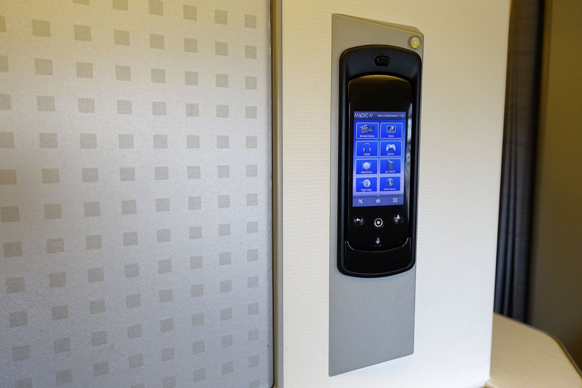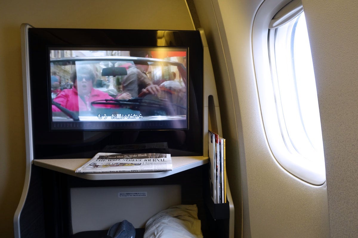 Each seat has a huge 23-inch screen — the same size JAL has in the much larger first-class suites. It was fairly sharp, though the glossy finish meant there was a lot of glare whenever the window was open. JAL offers a decent selection of recent Hollywood flicks, but there are very few TV shows to choose from. Oddly, it's apparently impossible to turn off the Japanese subtitles if you're watching English-language programming.