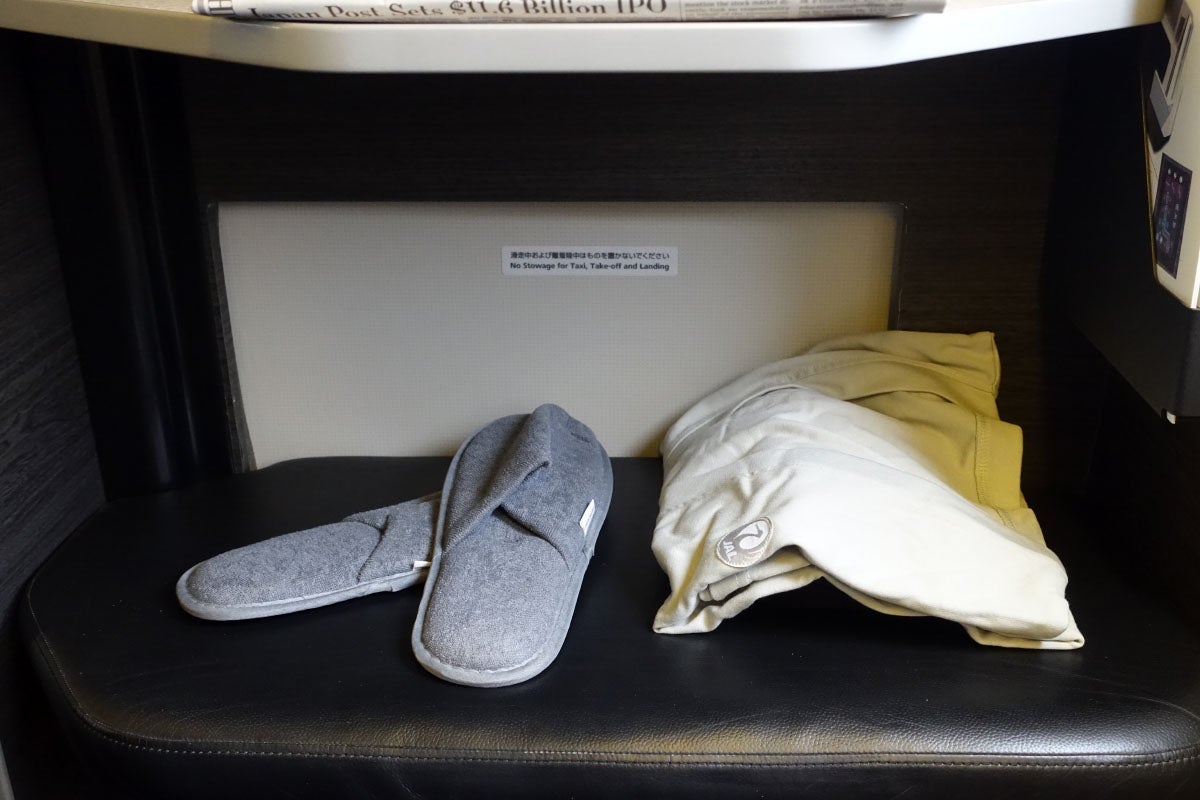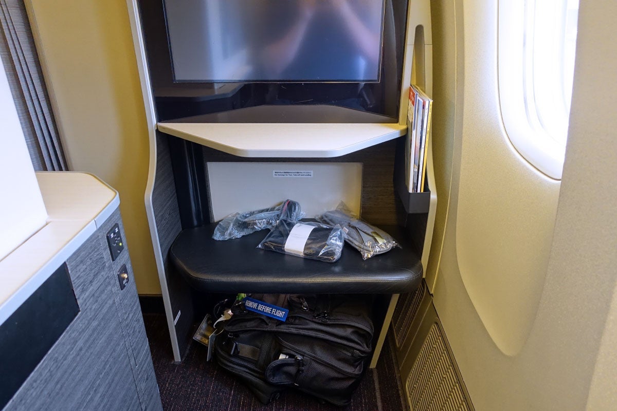 Along with a Tumi amenity kit, slippers and sealed noise-canceling headphones. As you can see above, there's enough room below the ottoman for a large backpack, but a larger rolling carry-on won't fit.