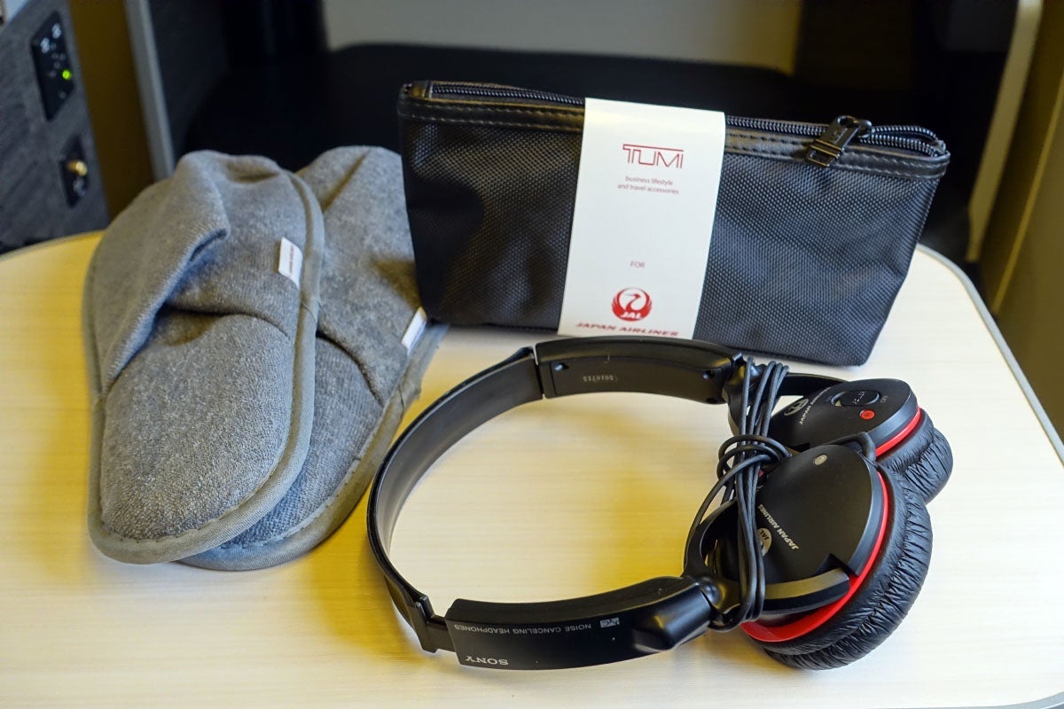 The Tumi pouch itself was excellent, as were the slippers. JAL's Sony noise-canceling headphones aren't quite as nice as the Bose headphones you'll receive on AA, but at least the flight attendants didn't come by to collect them an hour before landing.