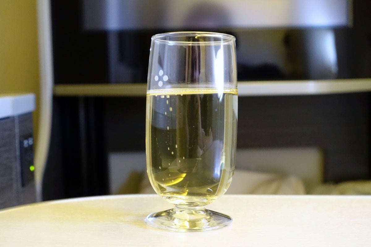 Then, a glass of Champagne followed a moment or two later. JAL serves Delamotte Blanc de Blancs, which retails for about $50 on the ground. It tasted fine, but it's no Dom or Krug. JAL also offers a variety of spirits, including Japanese and American whiskey, Bombay Sapphire Gin, Absolut Vodka and Baileys Irish Cream.