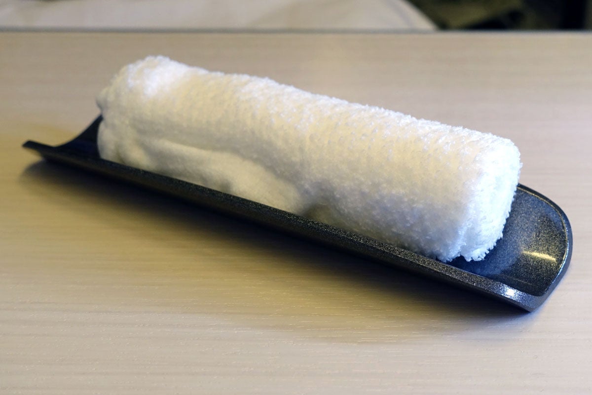 Finally, on to the food. A flight attendant came by with a hotel towel shortly after boarding.