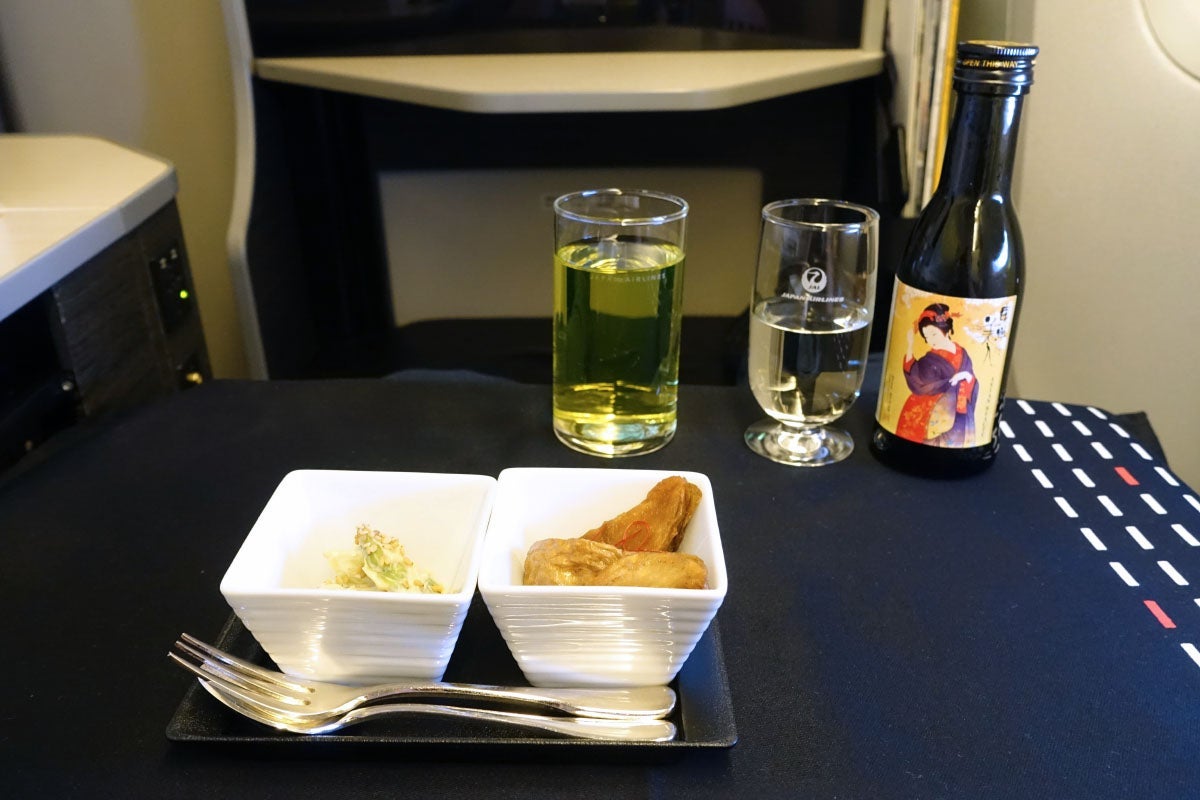 After takeoff, I had a small bottle of Toyo Bijin Junmai Ginjo sake, which was excellent. I also ordered a glass of JAL's "Sky Time Kiwi" original drink. That was served with an amuse-bouche of asparagus and string beans with foie gras sauce and a small dish of fried potatoes with chile. JAL's has branded its in-flight product as B.E.D.D. — Bed, Dining, Delicious and Dream.