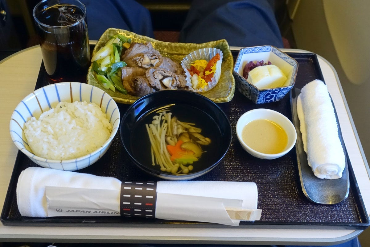 Prior to landing, I had the second Japanese set meal, which was served all at once and consisted of a wagyu beef roll, leeks, clear soup with mushrooms, steam rice and Japanese pickles. I also requested a glass of Diet Coke. The western option, meanwhile, included a lettuce salad with scallop and mushroom sauce. I think I made the right choice.