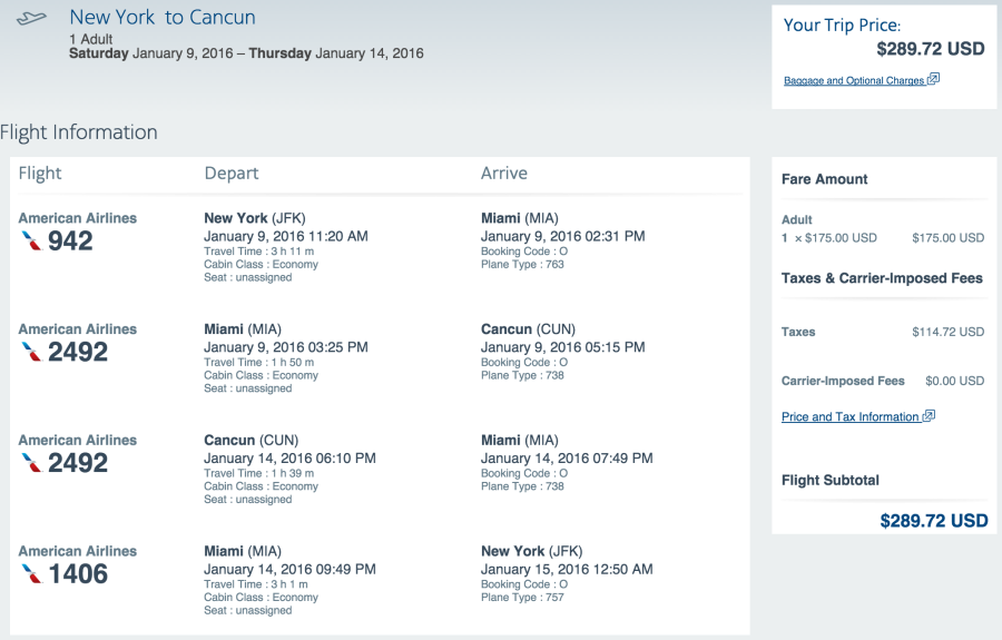 New York (JFK) to Cancun (CUN) for $290 on American (earns 3,421 EQMs):