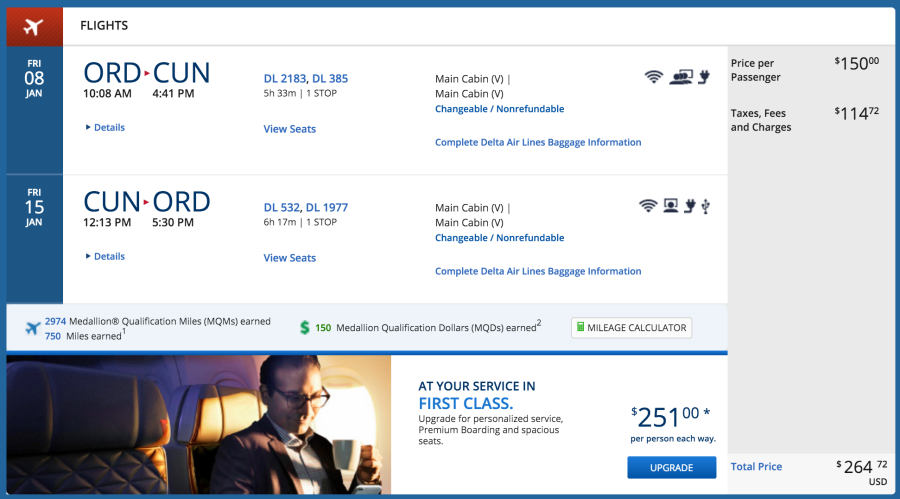 Chicago (ORD) to Cancun (CUN) for $265 on Delta (earns 2,974 MQMs):