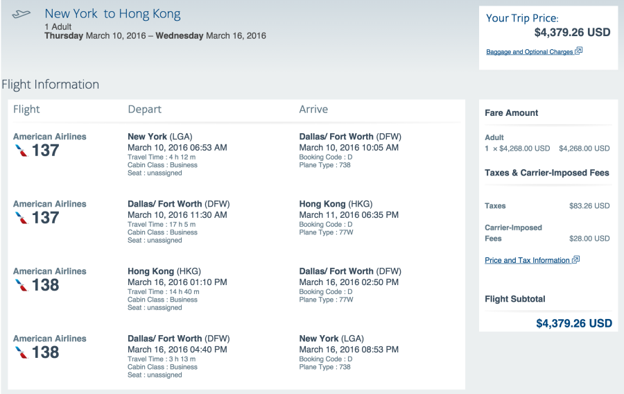 New York to Hong Kong for $4,380 in business class.
