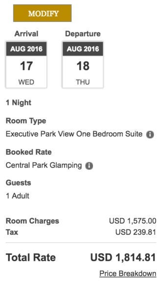 The Glamping by the Park package is available year-round. Although packages start at $1,675, I've found a couple dates that are going for just $1,575 per night. Note that if you do choose to glamp in Trump's Manhattan hotel, there's a steep cancellation fee. If you cancel within 48 hours prior to 4:00pm of the day of arrival, you'll be charged for one night plus taxes and fees.