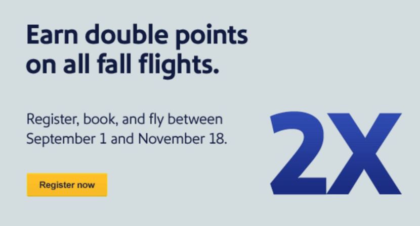 Southwest is offering select Rapid Rewards members a pretty simple way to earn bonus points on travel this fall. Targeted members received an email, detailing the promotion and a link to register to earn 2x points on all flights between September 1 and November 18, 2016.