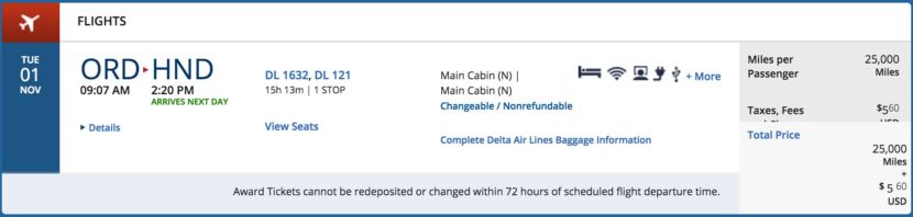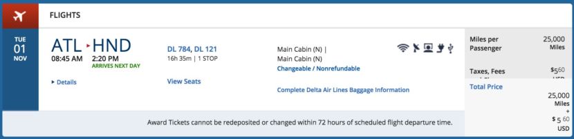 Atlanta (ATL) to Tokyo (HND) for 25,000 miles + $5.60 one-way: