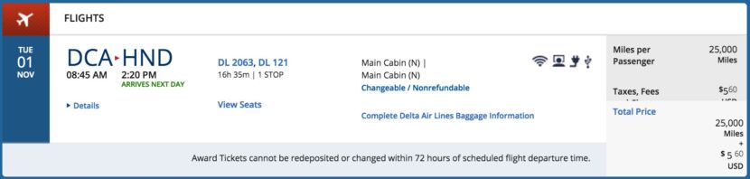 Washington, D.C. (DCA) to Tokyo (HND) for 25,000 miles + $5.60 one-way: