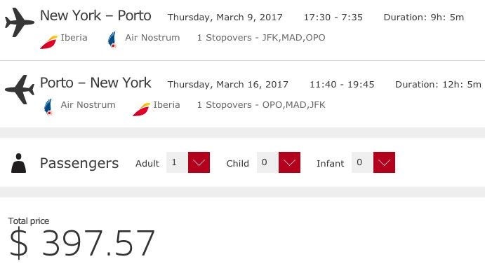 New York (JFK) to Porto (OPO) for $398 round-trip in March:
