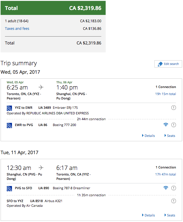 Toronto (YYZ) to Shanghai (PVG) for US$1,710 round-trip: