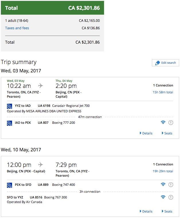 United is offering discounted business-class fares from Toronto (YYZ) to China from just $1,710 round-trip. You can fly to either Beijing (PEK) or Shanghai (PVG) with availability from March through May 2017.