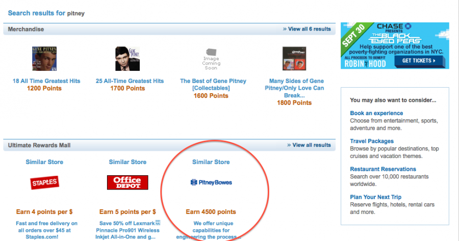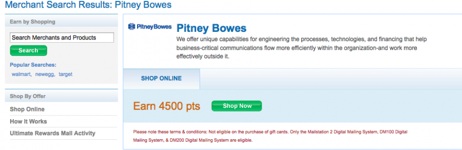 Coming off the heels of the 2,500 point stamps.com Ultimate Rewards freebie (which seems to be dead now), I noticed that Pitney Bowes is offering 4,500 points when you get one of their mailing machines. Just log into your Ultimaterewards.com account and search for Pitney in the top right.