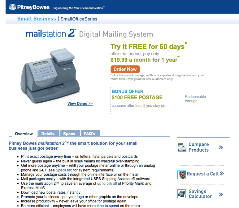 When I clicked through, I thought they'd be obscenely expensive, but to my surprise the Mailstation 2 Digital Mailing System was actually free for 60 days. The only charges were $30 in pre-loaded postage and $9.99 and they even have a Satisfaction Guarantee: