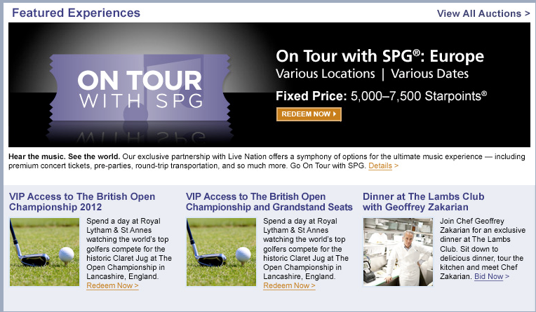 While some of these can be good deals such as the SPG concert tickets for only 5,000 Starpoints, others are horrible such as the Bourne Legacy movie premiere for 250,000 miles. When looking, just make sure it makes sense to redeem for an experience or if it is better to hold your miles to redeem an award ticket that is a better value for you. Most of these sites are updated often with new auctions, so keep checking back if you don't see something you like now.