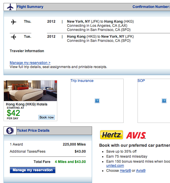 New York-Hong Kong R/T for 4 miles and $43