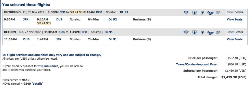 Delta from JFK to Dublin for $1,439 total roundtrip. S class, 9,540 Medallion Qualifying Miles earned.