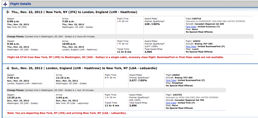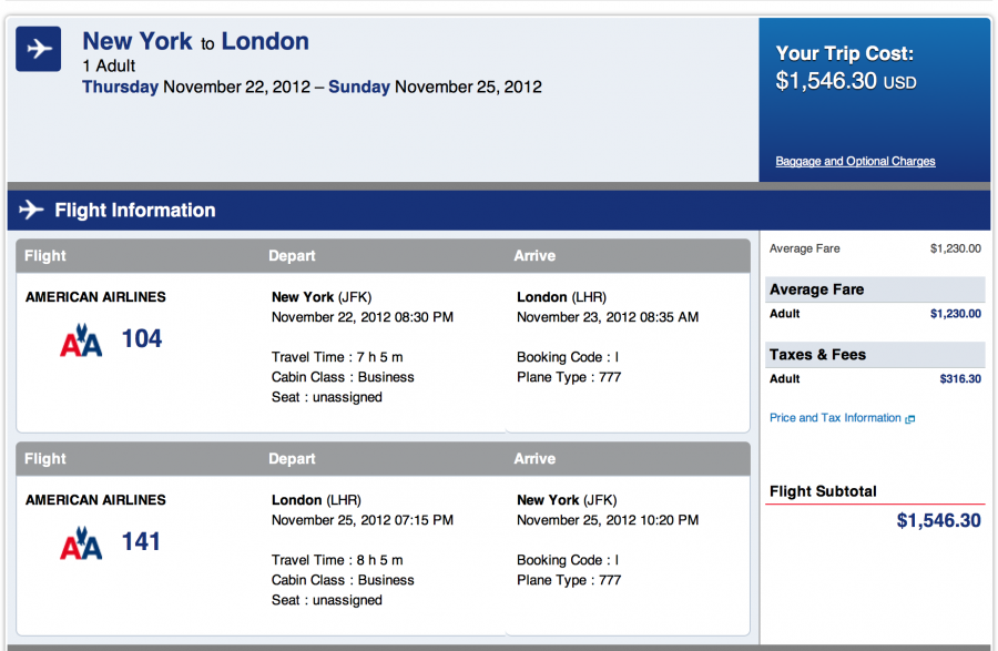 American Airlines JFK- London Heathrow for $1,546 total roundtrip in business (fare class I). This is a great route to use a systemwide upgrade because the 777s have the Flagship first class lie flat bed. Less than $1,600 for roundtrip first class airfare to London is an absolute steal! Unfortunately American doesn't give bonus elite qualifying miles for business class- only elite qualifying points, so you don't enjoy the class of service elite bonus that most airlines offer on premium fares.
