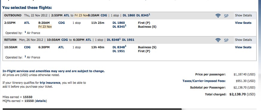 Delta from Atlanta to Paris via Miami roundtrip for $2,138- 15,550 Medallion Qualifying Miles.