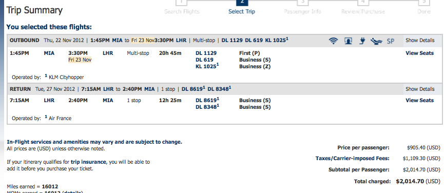 Delta from Miami to London (with out of the way routing via Detroit, Amsterdam and Paris to maximize mileage) for $2,014 roundtrip- 16,012 Medallion Qualifying Miles!