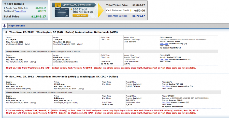 United from Washington Dulles to Amsterdam via New York for $1,846 total roundtrip- 11,610 Elite Qualifying Miles.