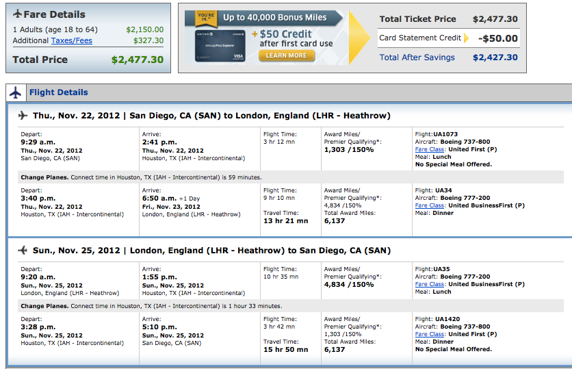 United San Diego to London via Houston for $2,488- 18,411 Elite Qualifying Miles.