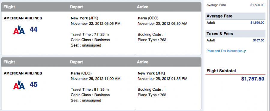 AA Business class JFK to Paris over Thanksgiving for $1,757 total roundtrip, which would qualify for this Business ExtrAA promotion