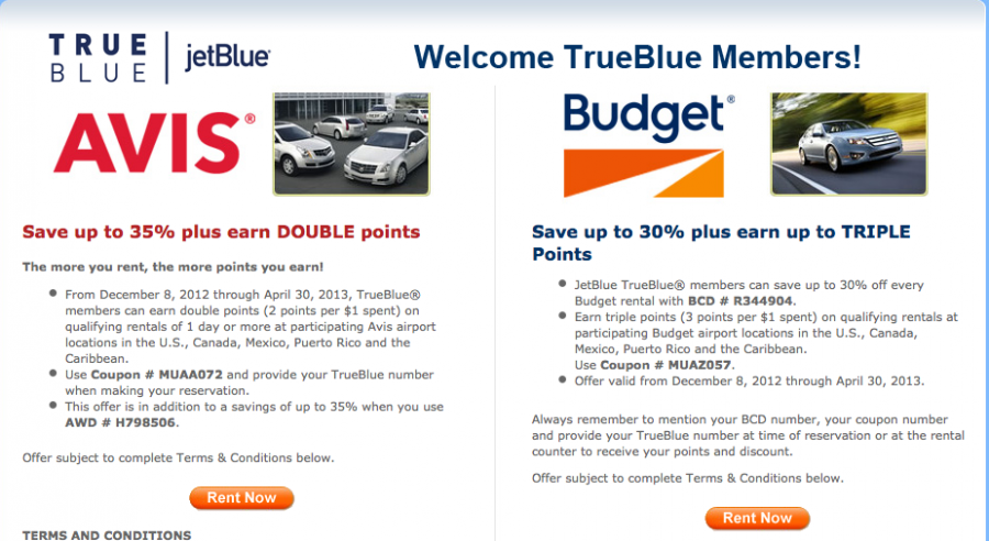 Earn Triple Elevate Points and Discounts With Avis and Budget: Virgin America has several car rental program partners including Avis and Budget, both of which are offering special discounts and earning bonuses right now. Now through February 28, 2013, Elevate members can earn triple points (3 points per $1 spent) on qualifying rentals of 2 days or more at participating Avis airport locations in the U.S. Use coupon # MUAA034 and provide your Elevate number when making your reservation. This offer is in addition to savings of up to 35% when you use AWD # G600004. Virgin America Elevate members can also now save up to 30% off every Budget rental with BCD # U106004. Earn 3 Elevate points for every $1 spent at participating airport locations in the U.S. Coupon # MUAZ008. Offer also valid now through February 28, 2013.Bonus TrueBlue Points and Discounts with Avis and Budget: Avis and Budget are also offering JetBlue frequent fliers special discounts and bonus points opportunities this winter. Until April 30, 2013, TrueBlue members can earn double points (2 points per $1 spent) on qualifying rentals of 1 day or more at participating Avis airport locations in the U.S., Canada, Mexico, Puerto Rico and the Caribbean. Use Coupon # MUAA072 and provide your TrueBlue number when making your reservation. This offer is in addition to a savings of up to 35% when you use AWD # H798506. JetBlue TrueBlue members can save up to 30% off every Budget rental with BCD # R344904. Earn triple points (3 points per $1 spent) on qualifying rentals at participating Budget airport locations in the U.S., Canada, Mexico, Puerto Rico and the Caribbean. Use Coupon # MUAZ057. Offer valid through April 30, 2013.