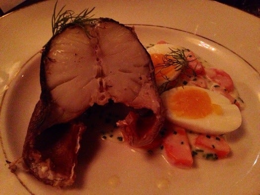The menu at Olympen is based on traditional Norwegian food, and changes many times a year in order to use seasonal ingredients. You could order a three course set menu or individual items as we did. If you were a beer drinker, they reportedly have more than 150 different beers available! We very much enjoyed the sausage and smoked haddock. Note that they did have an English menu available upon request. The meal was about $125 for the two of us including entrees, appetizer, and a glass of wine.