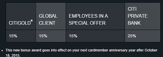 Starting on October 18, 2014, applicants to the Citi Prestige card who have certain banking relationships with Citi will receive additional ThankYou Points, including a 15% bonus for Citigold accounts, or 25% for those with a Citi Private banking relationship.